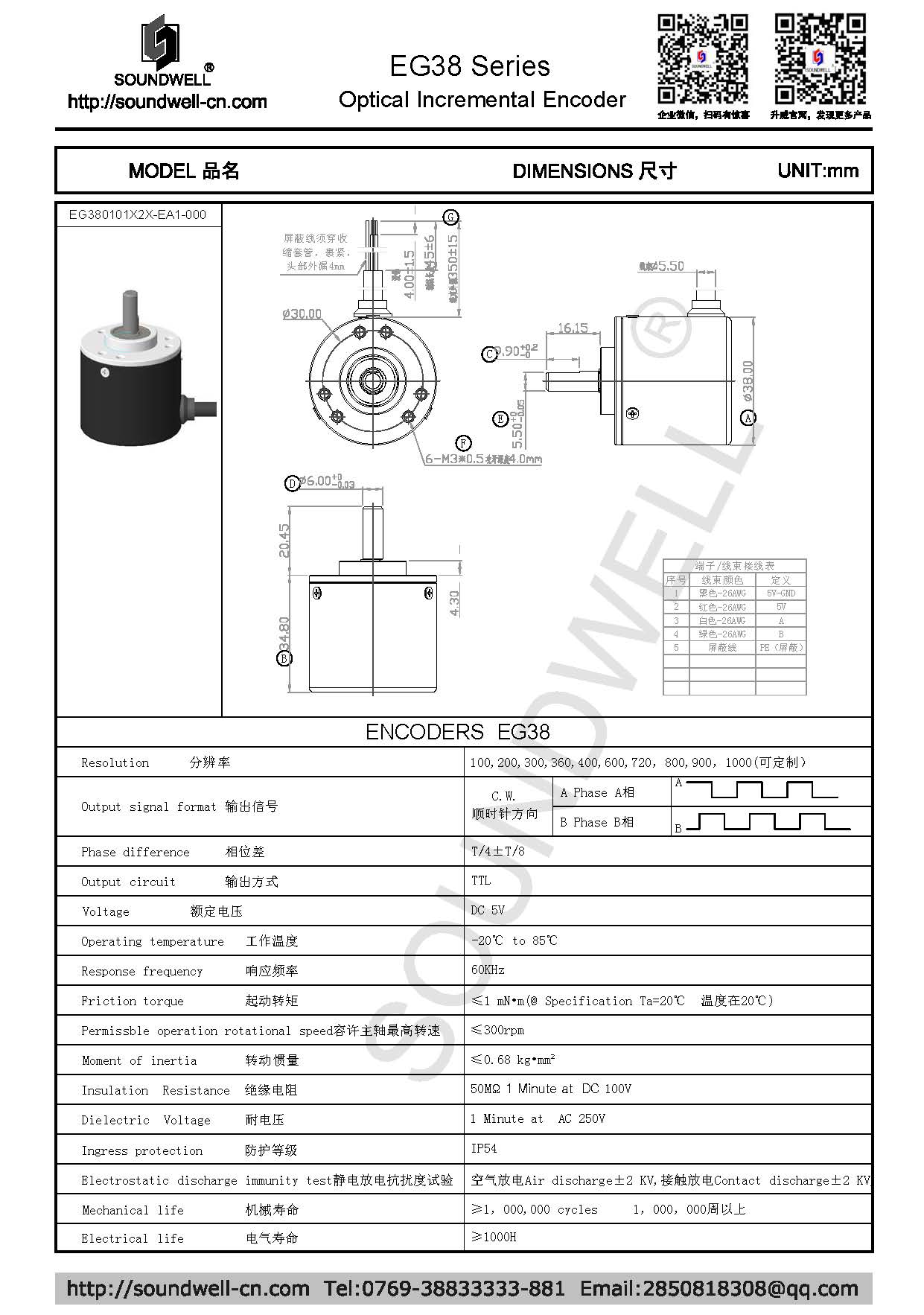 | Main Specifications: | Dimension: 38mm; Number of detent: Continuous rotation; Output resolution:100P, 200P, 300P, 360P, 400P, 600P, 720P, 800P, 900P, 1000P ect. (Customizable) Working temperature: -20℃~85℃; Input voltage: 5V; Protection Level: IP54 Reverse Polarity Protection; Output signal: A+, B+; Insulation resistance: 50M? 1 Minute at DC 100V; Dielectric voltage: 1 Minute at AC 250V; Rotation life: 1,000,000 cycles Min; Electrical life: 1000 hours Min; |
