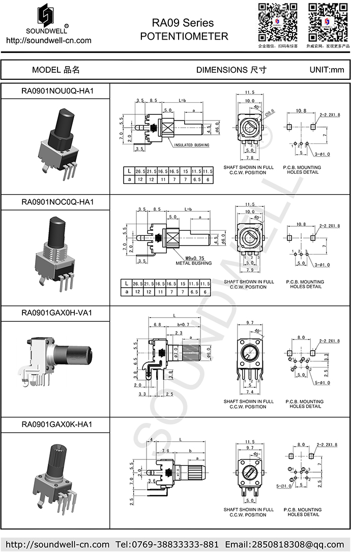 | Main Specifications: | Total resistance error: ±20% Full rotation angle: 280±10°/300±10° Rated power: 0.05W Operating temperature: -10°C~60°C Rotational life: 10,000 cycles Min |