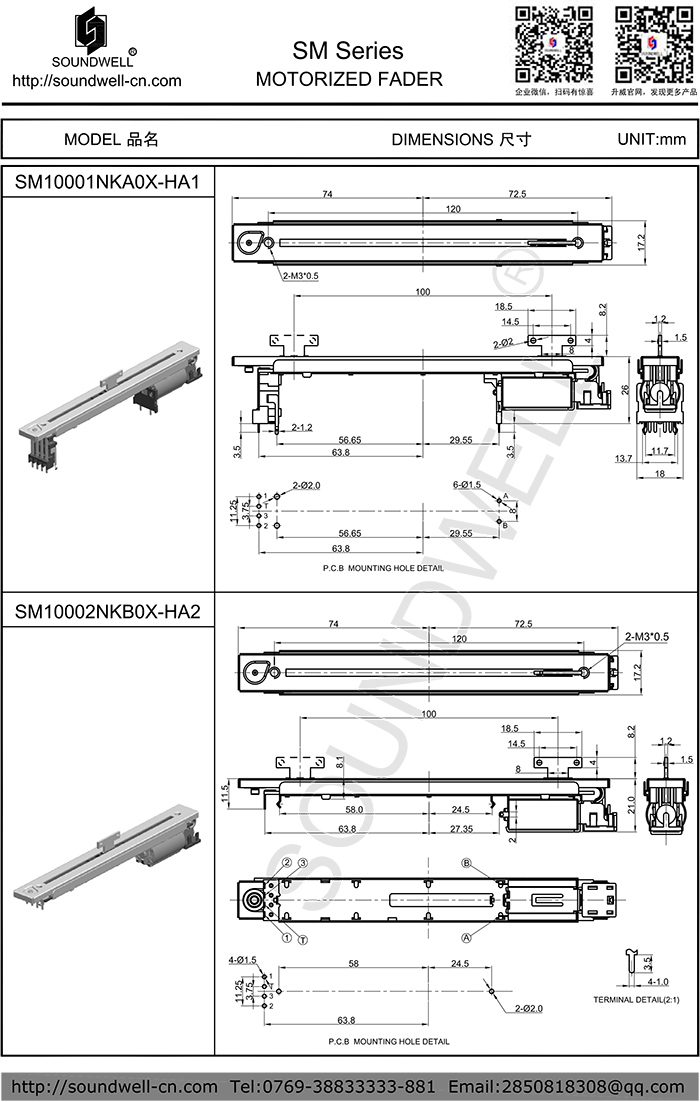 Maximum operating voltage: 200V AC; Motor working voltage: 6V~10V DC; Operating torque: 20~60gf.cm Operating temperature: -10℃~60℃; Sliding travel: 100mm±0.5mm; Operating life: 30,000 Min |