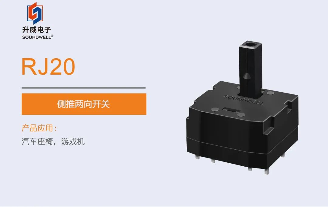RJ20是一款側推兩向開關,中間無按壓功能,應用到汽車座椅上,起到前后調節,高低調節及靠背調節的作用。此外,還可以應用在游戲機上。具有以下4項產品特點: